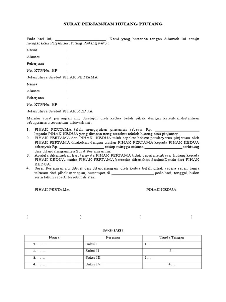 A.piutang b.peralatan c.biaya dibayar dimuka d.pendapatan jawab (d) 11. Selanjutnya disebut pihak kedua melalui surat perjanjian ini, disetujui oleh kedua belah pihak dengan ketentuan … Surat roya/keterangan lunas/pelunasan hutang dari kreditur; Perjanjian pengikatan untuk jual beli; Bapak winangun (ketua rt) (_____) download contoh surat perjanjian piutang.docx.